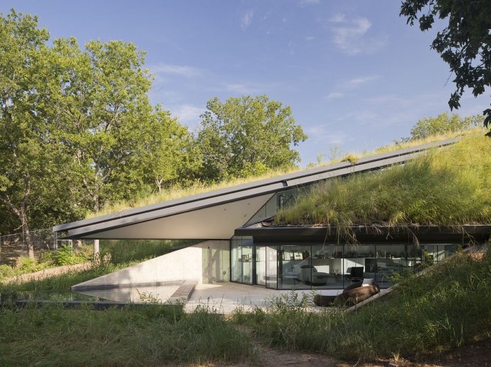 The architects of Bercy Chen Studio were inspired in designing this earth house by one of the oldest architectural typologies of North America – the so-called pit house. Like the Edgeland Residence, this traditional house is often buried in the ground, utilizing the advantages of geothermal energy. The insulated green roof of the Edgeland Residence works as a warming cover that additionally protects from rain and wind. Due to the embedding in the earth, the interior of the building has a constant climate – pleasant warm in winter, cool in summer. The reason for this is that the temperature of the soil scarcely changes under the layer of frost. By these constant temperatures, 80 % of the energy costs can be saved.